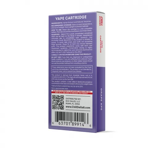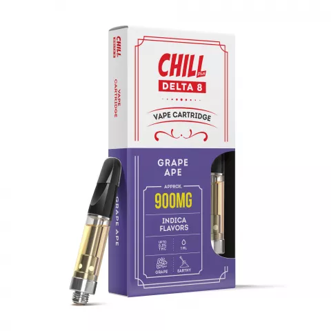 Now, Delta-8 can take you higher with grape!. With new Chill Plus Delta-8 Vape Cartridges in Grape Ape, you can embrace the carefree, soothing pleasure of this exciting new cannabinoid while experiencing the ultimate hybrid strain with our all-new Grape Ape. Delta-8 Vape Cartridges from Chill Plus offers you an enjoyable, completely legal cannabis-like high delivered right to your front door. Combined with a mostly-Indica hybrid that mixes Mendocino Purps, Skunk, and Afghani, you’ll find that Grape Ape makes everything super chill. In fact, Chill Plus CBD Delta-8 Vape Cartridges will have you floating on the clouds.